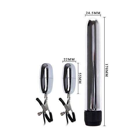 Вибрация же встроенных вибропулек усилит все приятные ощущения до максимума. А это именно то, что нужно во время секса, правда? В комплекте: зажимы для сосков, вибратор. Длина вибратора - 17 см., диаметр - 2,4 см. Длина вибропуль на зажимах - 5,5 см.