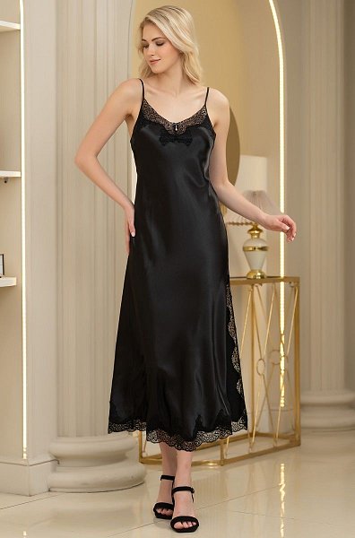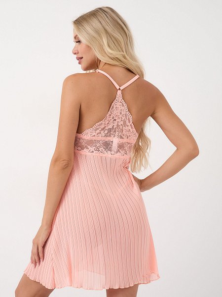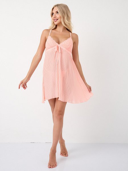 Тонкая и приятная к телу материя ласково струится по женскому силуэту, делая ее естественные изгибы еще более соблазнительными. Кружевной бюст красиво акцентирует внимание на пышной груди.Трусики-стринги нежно прикрывают промежность. В комплекте: сорочка, трусики-стринги.