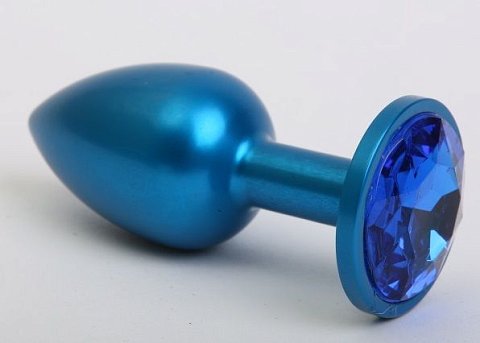 Серебряная металлическая анальная пробка среднего размера с синим стразиком - 8,2 см.