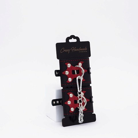 Черные кожаные наручники с красным декором и строчкой