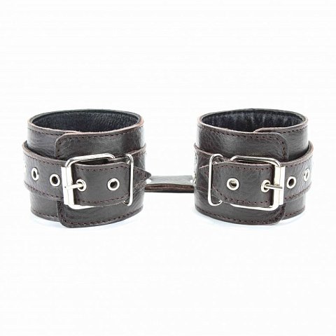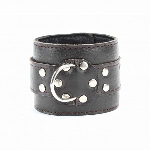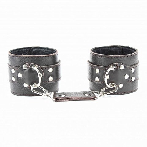 Наручники выполнены из натуральной мягкой кожи темно-коричневого цвета. Изделие декорировано заклепками. По середине расположено полукольцо из сварной фурнитуры. Наручники надежно фиксируются пряжками и ремнями, позволяющими выбрать нужный размер, подойдут на обхват руки от 16 до 24 см. Кожаное соединение на карабинах фиксирует наручники вместе. Приятные для тела и стильные наручники отлично подходят для воплощения эротических БДСМ игр. Ширина - 6 см. Длина соединения - 14 см.