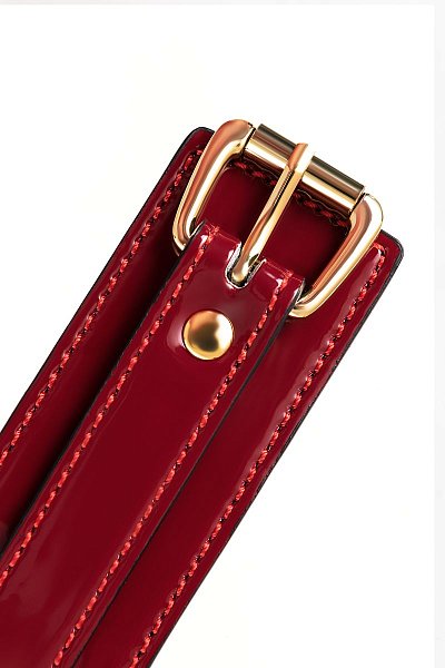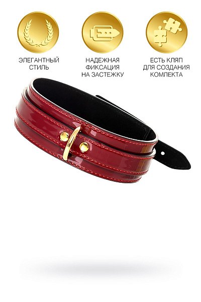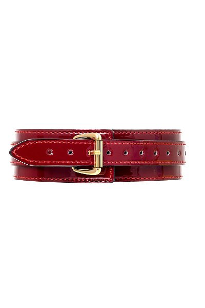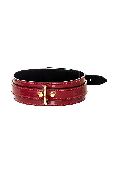 Ошейник из лакированного материала благородного винного цвета с металлической отделкой золотого цвета. Он демонстрирует утонченный вкус обладателя, одновременно являясь достаточно строгим атрибутом БДСМ-тематики. Он достаточно жестко обхватывает шею, зато в нем вы всегда будете слушаться своего Господина без возможности опустить голову. Кольцо на ошейнике позволяет дополнить игру поводком или другими необходимыми аксессуарами. Размер регулируется металлической пряжкой. Ширина - 4 см.
