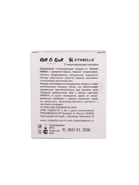 Roll & Ball – прозрачная желтая стимулирующая насадка в виде презерватива с накопителем цилиндрической формы и пятью эластичными синими шариками. Насадка покрыта силиконовой смазкой с ароматом банана, которая обеспечивает легкое и комфортное скольжение.