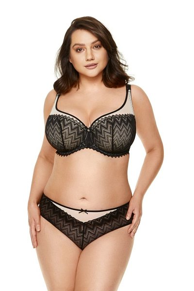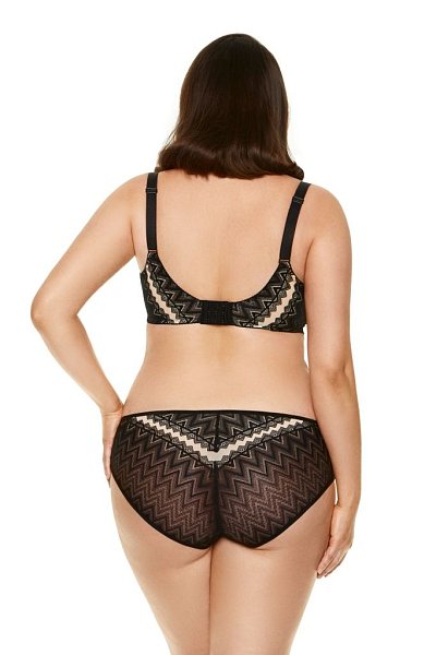 Бюстгальтер Echo из гипюра с геометрическим рисунком, на косточках, с дополнительными боковыми поддержками, чашки шитые, нижняя часть на тонком поролоне телесного цвета, верхняя часть из сетки телесного цвета, внутренняя сторона проложена хлопковым трикотажем. Бретельки не отстёгиваются, регулируются по длине. На спине застёжка на удлинитель.