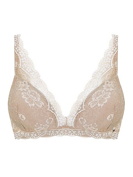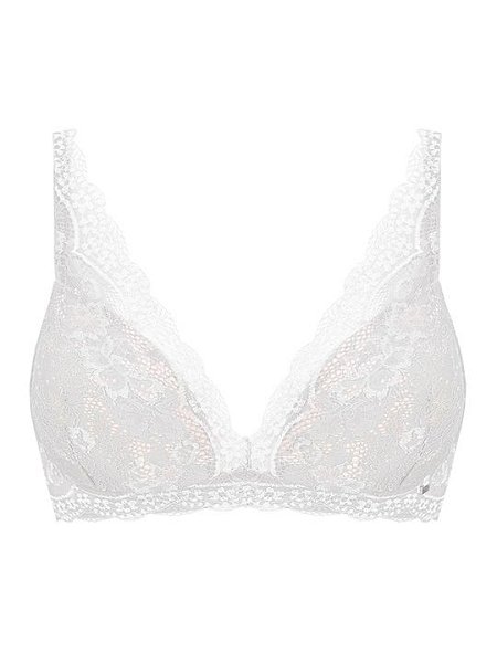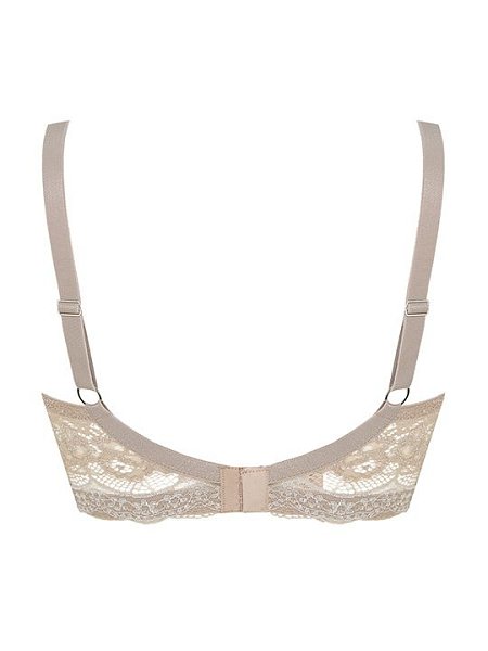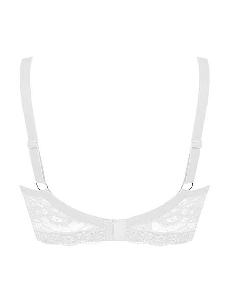 Бюстгальтер-спейсер, без косточек. Внутренняя часть чашки усилена боковым подкроем из двойного слоя сетки, переходящего на переднюю часть бретелей. Стан спереди дублирован неэластичной сеткой. Бретели несъемные, регулируемые. Застежка два крючка на четыре позиции. Выполнен из эластичного кружева высокого качества.