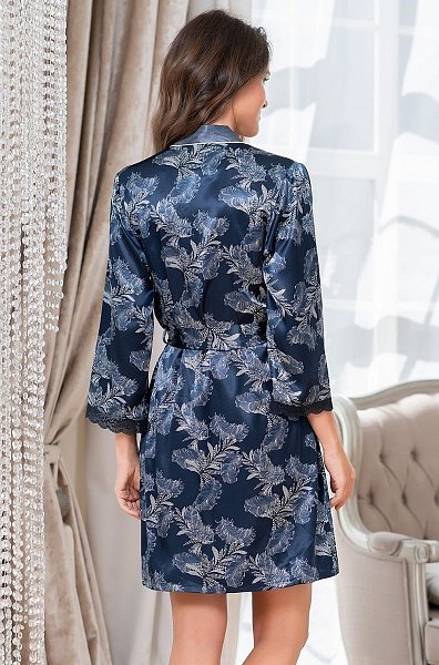 Короткий запашной халат с широким длинным рукавом, выполнен из принтованного смесового шелка с отделкой тканью компаньоном и контрастным кантом. Края рукавов обработаны узким кружевом. По бокам расположены карманы.