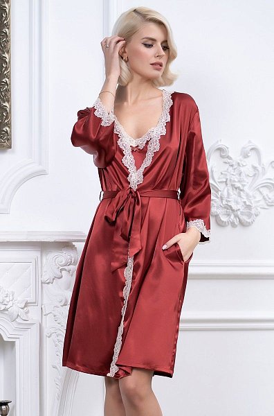 Короткий халат с рукавами 3/4 выполнен из искусственного шелкового полотна с атласным блеском. Рукава и борта халата декорированы изящным кружевом. Халат на запахе с поясом, в боковых швах есть карманы.