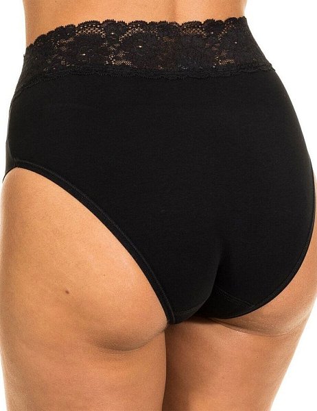 Трусики-слип с высокой линией талии из хлопковой ткани с особым покрытием Silk touch, декорированные кружевом. Высота бочка 14 см. Линия открытия ноги спереди обработана мягкой окантовкой, сзади плоской эластичной резинкой. Роль резинки на талии выполняет мягкое суперэластичное кружево. Ластовица выполнена из уникального хлопкового материала.