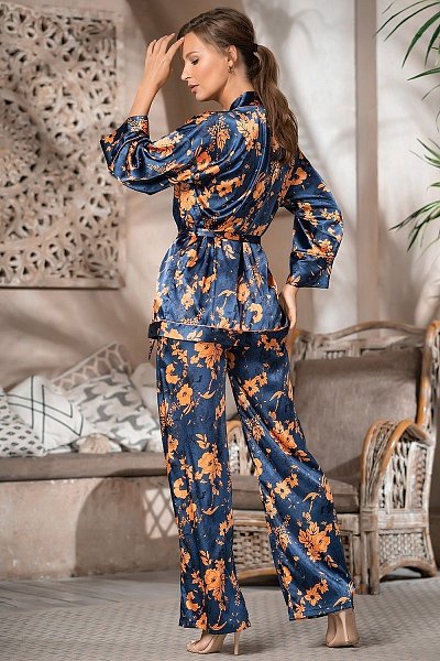 Комплект-тройка состоит из топа на тонких бретелях, брюк-паллацо и запашного жакета, выполнен из принтованного смесового шёлка. Воротник, низ жакета и манжеты жакета декорированы контрастным кантом. Топ выполнен из синего атласа. В комплекте: топ, брюки, жакет.