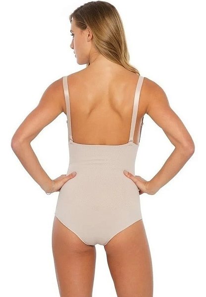 Высокий пояс-трусы для коррекции талии снабжены поддерживающими бретельками, регулируемыми по длине и отстёгивающимися от пояса, фурнитура пластмассовая в тон. С левого бока застёжка на тройной удлинитель на крючках, ластовица проложена хлопком и снабжена застёжкой-удлинителем на три крючка. Пояс выполнен из плотной дышащей ткани двойного плетения, зона ягодиц не корректируется.